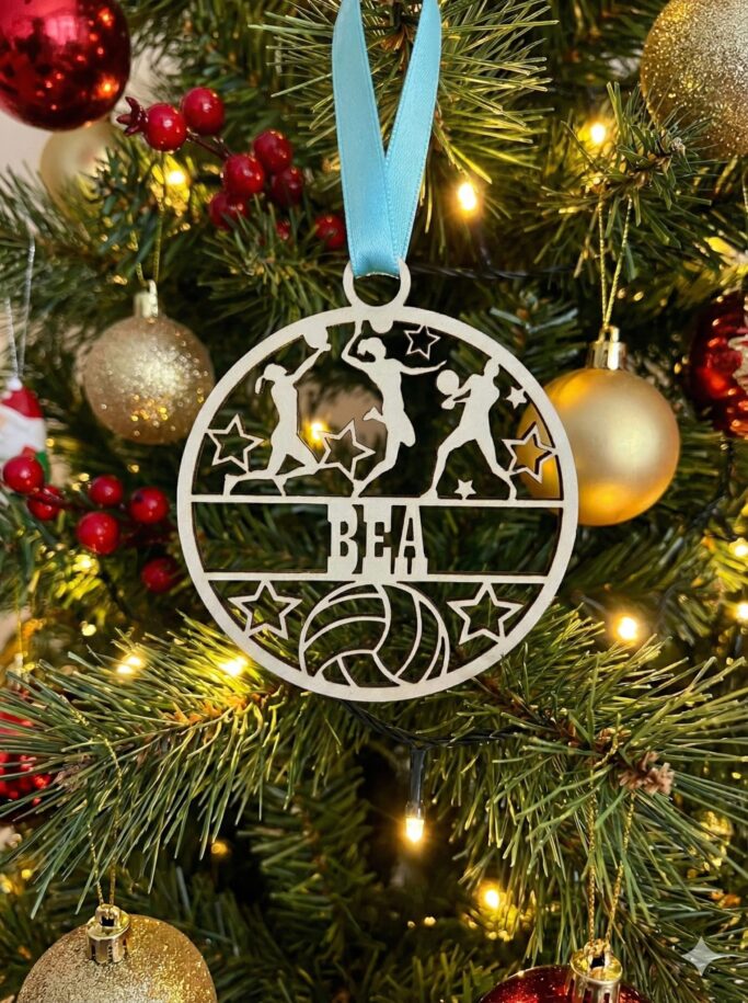 Bola decorativa em madeira MDF personalizada com nome e modalidade desportiva. Ideal como prenda de Natal original e especial, perfeita para atletas, treinadores ou fãs de desporto. Acabamento de qualidade e personalização única.