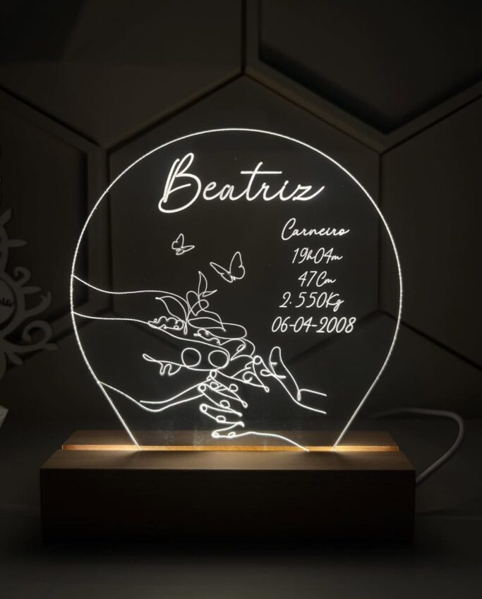Ilumine e decore com um toque único! Nosso candeeiro personalizado em acrílico é a peça perfeita para celebrar nascimentos ou outras ocasiões especiais. Gravado com os dados de nascimento, como nome, data e hora, ele se torna uma lembrança única e cheia de significado. Com design moderno e material de alta qualidade, é um presente perfeito para qualquer ambiente, oferecendo não só luz, mas também um significado profundo e pessoal.