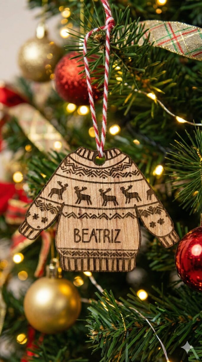 Dê um toque especial e divertido à sua árvore de Natal com este enfeite em forma de camisola, produzido em MDF gravado a laser. Com padrões natalícios e a possibilidade de personalização com nome, é ideal para criar uma decoração única ou para oferecer como presente cheio de carinho.